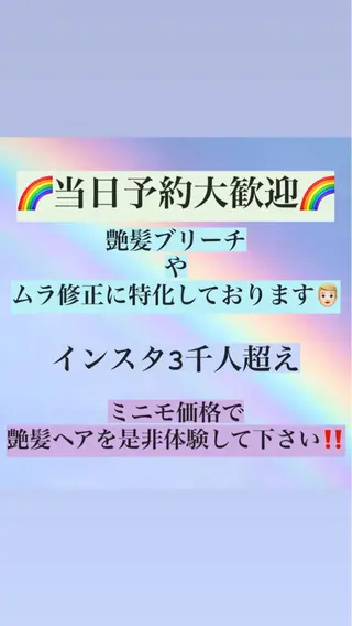 【⚠️空きあります❗️】当日予約大歓迎⭐️都内有名店で得た丁寧なブリーチ施術💎プレミアムケアブリーチ💎根元リタッチ💎全頭ブリーチ💎ムラ修正💎ケアカラー💎ダブルカラー💎メンズもok!!数ある掲載の中からワタナベのページを見て頂きありがとうございます!🧸⭐️都内有名店で得た丁寧なブリーチ施術、根元リタッチから全頭ブリーチまで、ムラや複雑履歴を綺麗になりたい髪色に!丁寧なカウンセリング、半年、一年後までイメージして施術する事を心がけています!少しでも気になることなどお気軽にご相談ください🙇🏻♂️✨なりたい髪型髪色へぜひお手伝いさせてください🦉⭐️【💎施術へのこだわり💎】🌀技術もですが経験値と薬剤知識が豊富だと自負しています。ブリーチの際はプレミアムケアブリーチを使った施術で根本からダメージを軽減させつつ、頭...