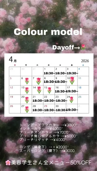 数ある中からご覧いただきありがとうございます♪技術向上の為、カラーモデル様募集しております🐈⬛💙レディースもメンズも大歓迎です🩵平日→20:00-土日祝→19:00-営業後のお時間での施術となります♪Before・Afterのお写真を取らせていただいておりますので、ご協力頂ければ幸いです💙🩵全メニュー前日までのご予約をお願いします⋆⸜🌀⸝⋆必ず【注意事項】をお読みの上ご予約をお願いします🙇♂️💙💙🩵予約リクエストも承っておりますので、ぜひお待ちしております🩵💙また質問等ございましたら、メッセージ・instagramまで...