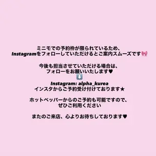 Access📍今福鶴見駅から徒歩2分👣幅広いデザイン技術と持ちのいい施術🤍可愛い爪先お任せ下さい♪♪(ご予約前に注意事項を必ずお読み下さい)【持ち込み画像OK!!】🙌🏽ご新規様もリピータ様もオフ込み料金🙌🏽お気に入り登録して頂くと、予約確定していなくても✉が送れるようになります♪当サロンをご覧いただきありがとうございます☺️自宅サロン、プライベート空間です♪お子様連れの方でも周りを気にせず安心してお過ごし下さい。新しいカラーやパーツ、新着情報日々更新してます!𝕝𝕟𝕤𝕥𝕒𝕘𝕣𝕒𝕞→mimiyun.nailフォローよろしくお願いします🤎自爪を痛めないフィルイン(ベース1層残し)推薦サロン◎基本的にアセトンを巻かないオフで...